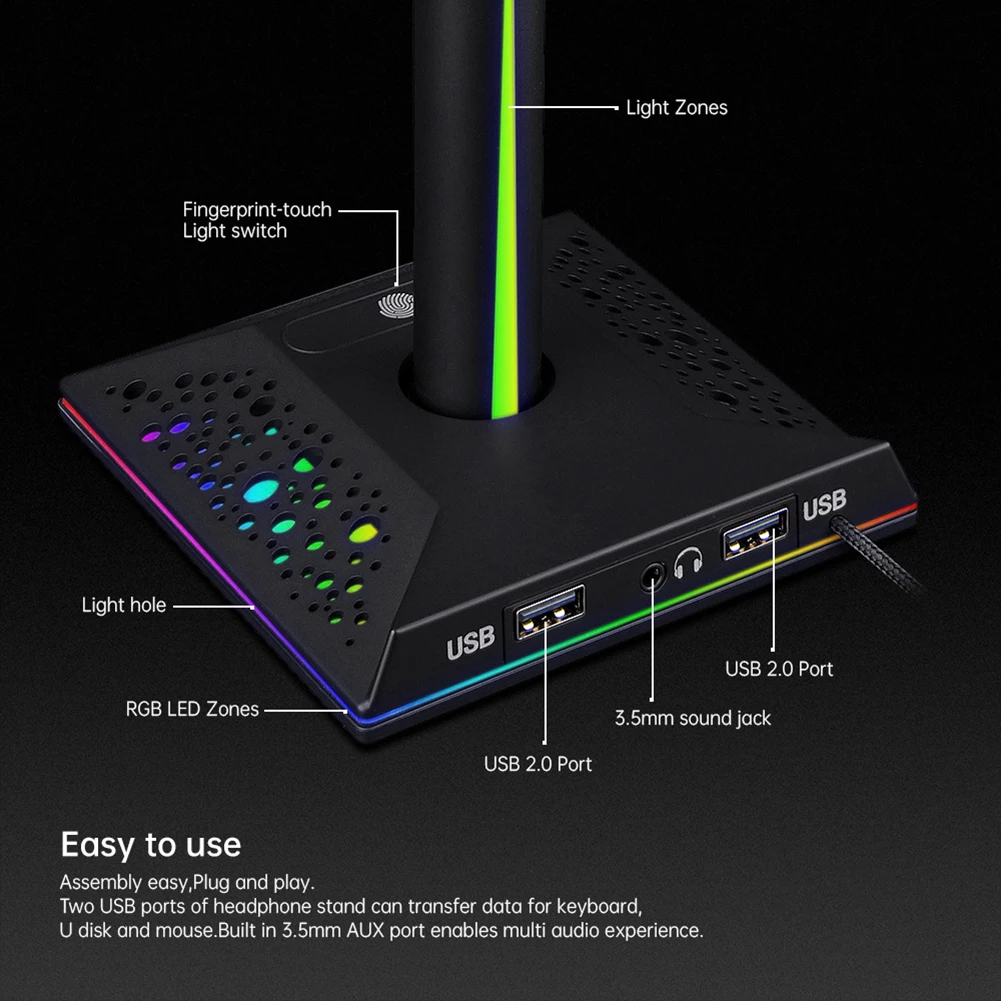 Special Offer 2つのUSBおよび3.5mmポートを備えたRGBヘッドフォン,ゲームコンソールおよびゲーマー用のヘッドフォンホルダー,棚 Discount [NEW!!] Today!